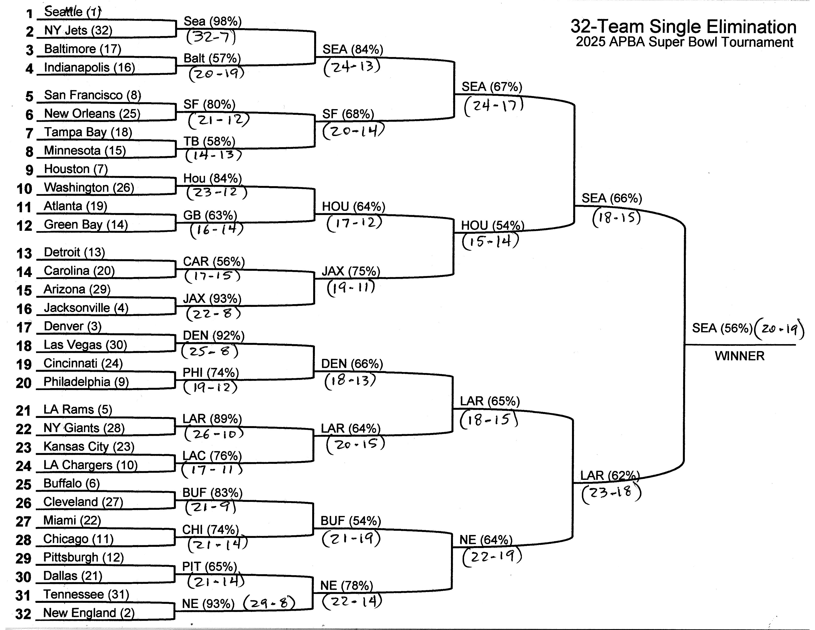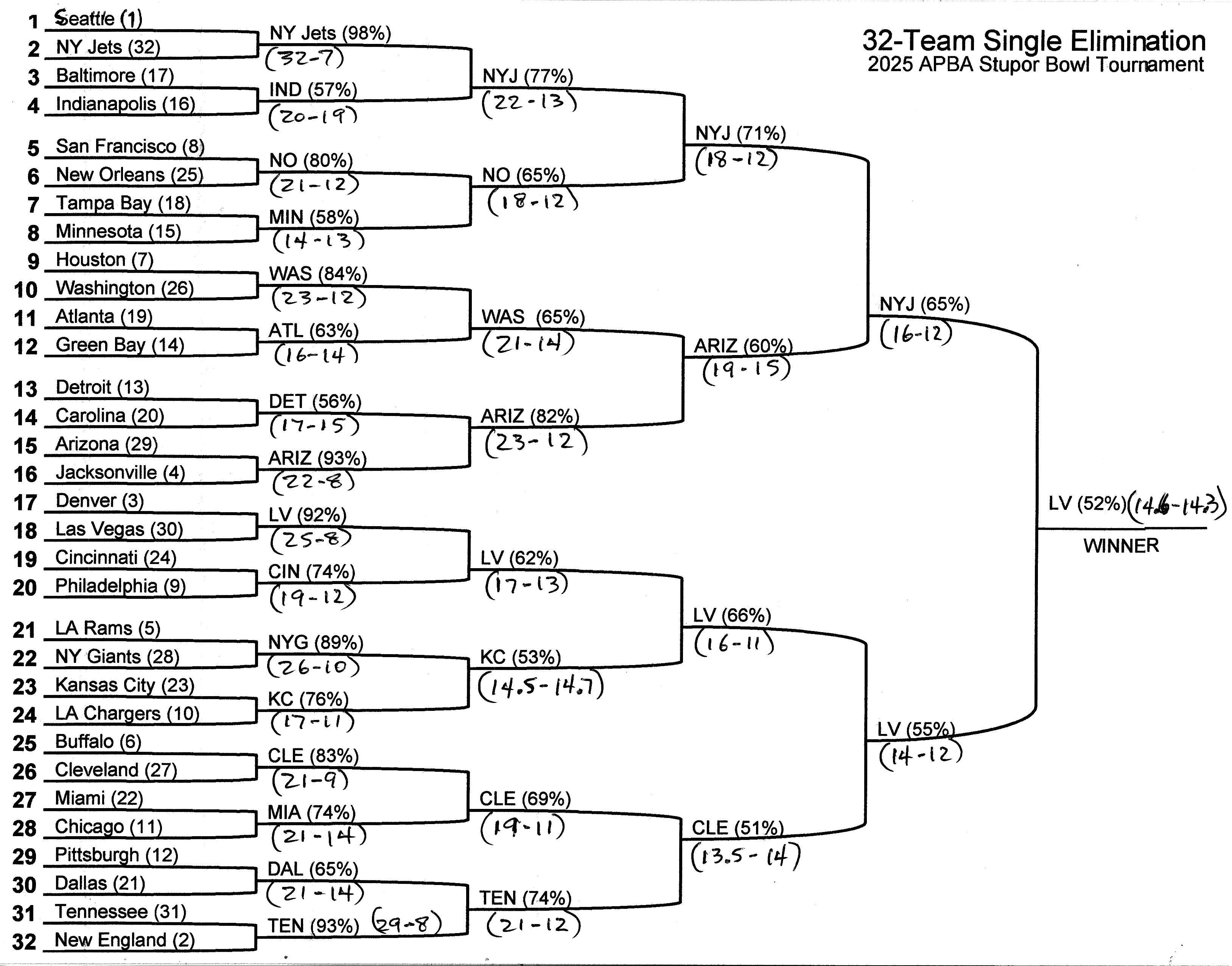 Attached are the results of my 2025 APBA Super Bowl & Stupor Bowl Tournaments. The first one is the Super Bowl Tournament. This is a round-robin single-elimination tournament in which all 32 teams are ranked, based on win-loss records and margin of victory, and they are placed in a bracket. Each match-up consists of 100 replays between the two teams, each team playing 50 home games and 50 road games. The winners advance to the next round, and the losers are eliminated. Next to each team is the winning percentage of the match-up, and in parentheses is the average score of the 100 replays. In the Stupor Bowl Tournament, the losers advance, and the winners are eliminated. Next to each team is the losing percentage of the match-up, and in parentheses is the average score of the 100 replays. What these tournaments reveal is the best team in the league, and the worst team in the league based purely on talent. If these teams played to their capabilities, then each team would be the absolute best team and the absolute worst team.